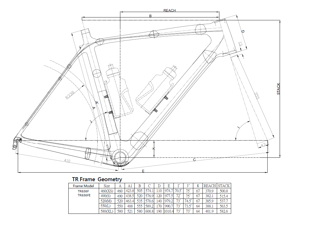 TR636FE全碳纤维车架,采用特殊形成的面和下管造型,在展场上很多车友都觉得很好看,压入式BB86提高了强度和动力传递,车架走线采用全走内线,整体上有整洁的外观和低风阻的功能,TR636FE勾爪是Thru axle-Flat Mount虽然比较重,但是在大冲击下可以避免快拆脱落。