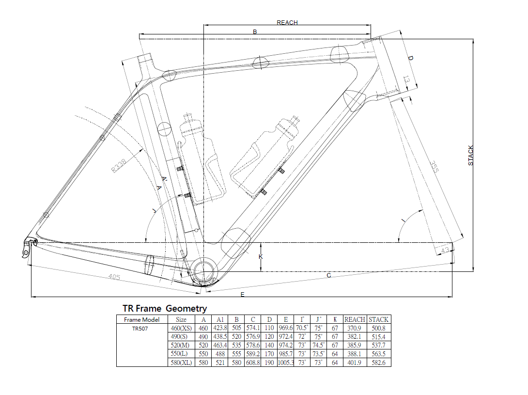 TR507全碳纤维车架,采用特殊形成的面和下管造型,压入式BB86提高了强度和动力传递,车架走线采用全走内线,整体上有整洁的外观和低风阻的功能,煞车系统单独采用c夹,是比赛专用的公路车。
